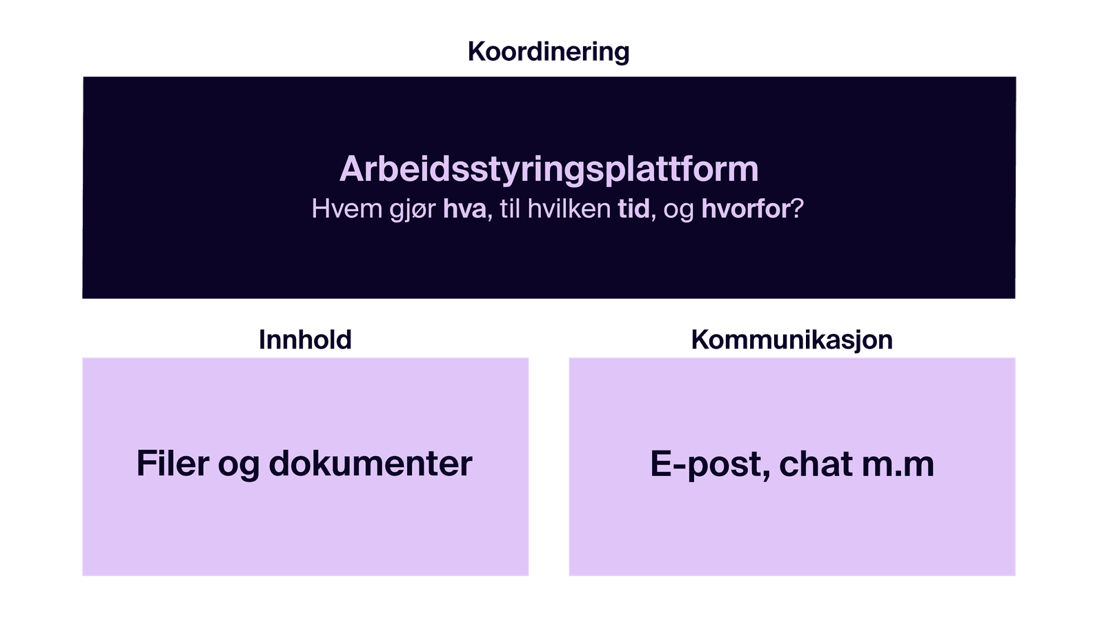 Det mange mangler, er en plattform for koordinering på toppen som bringer det hele sammen – som knytter filene og kommunikasjonen til konkrete oppgaver, og gir oversikt over hvem som skal gjøre hva, når – og hvorfor.