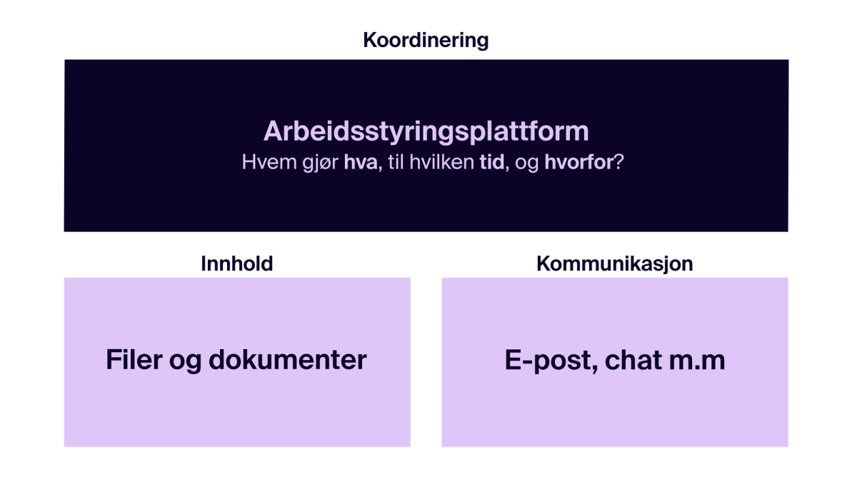 Det mange mangler, er en plattform for koordinering på toppen som bringer det hele sammen – som knytter filene og kommunikasjonen til konkrete oppgaver, og gir oversikt over hvem som skal gjøre hva, når – og hvorfor.